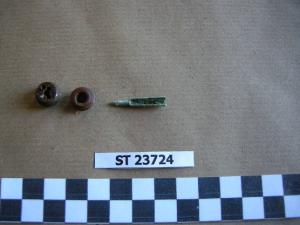 Staffa di fibula con sezione a "C" e terminale appuntito, su cui erano infilate due perle bitroncoconica in ambra decorate con profilature e attraversate l'una da un foro passante circolare, l'altra da cinque.
