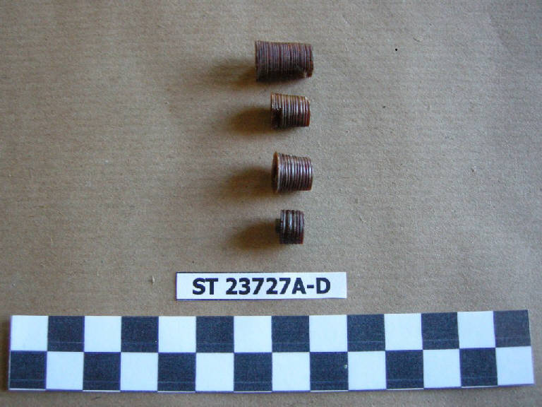 A, B, C): vaghi in ambra di forma troncoconica, profilati; D) vago in ambra di forma cilindrica; sono tutti attraversati da un foro passante all'interno del quale A, B e D conservano anima in filo di bronzo e probabile materiale ligneo. Ornamento di fibula.