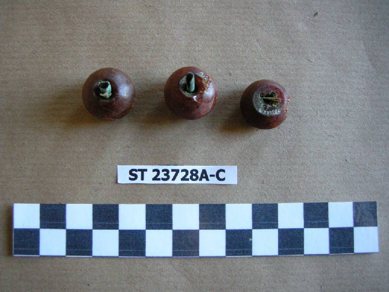 Perle in ambra di forma globulare, attraversate da fori passanti in cui sono infilati frammenti di filo in bronzo rivestiti di materiale ligneo.