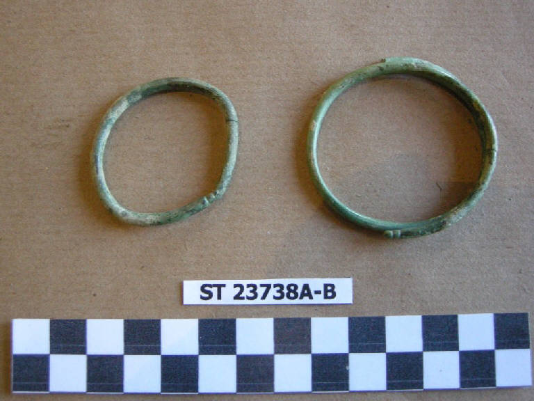 Due armille a spirale a sezione circolare con estremità rastremata e definita da due costolature, forma ellittica.