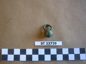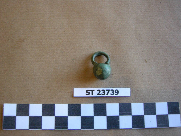 Pendaglio a cestello, anello di sospensione a sezione circolare, fondo appuntito, due forellini.