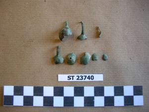 Frammenti di lamina in bronzo riferibili ad un pendaglio a cestello (parte dell'anello di sospensione e del cestello vero e proprio.