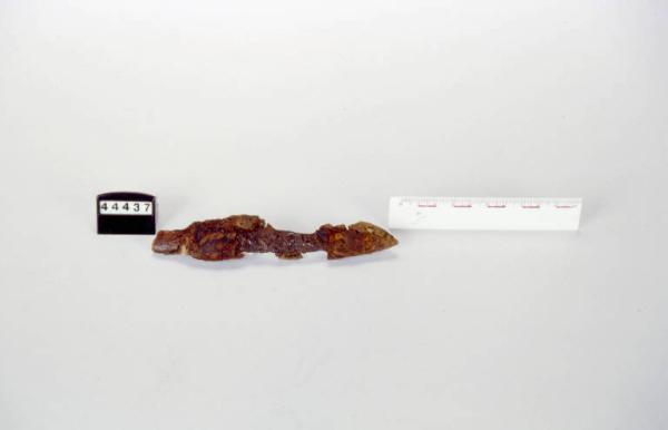 Coltellino in ferro con piccolo codolo in legno e frammenti di fodero in cuoio