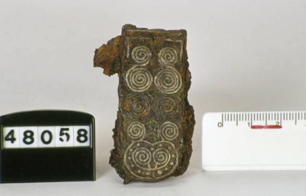 Puntale di cintura con consistenti tracce di stoffa mineralizzata