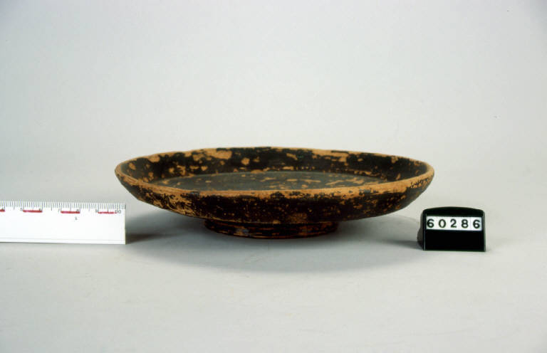 Vasca a pareti diritte leggermente rientranti in alto, orlo indistinto, piede ad anello con spigolo esterno.