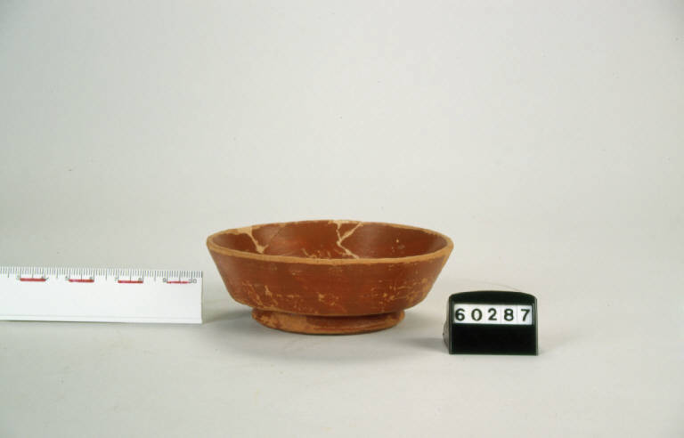 Coppetta a orlo indistinto, vasca a pareti diritte oblique, fondo piatto, basso piede ad anello.