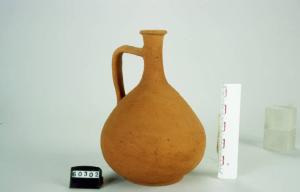 Labbro svasato, alto collo, corpo piriforme, piede a disco ansa a nastro impostata ad angolo ottuso sulla spalla e saldata al collo