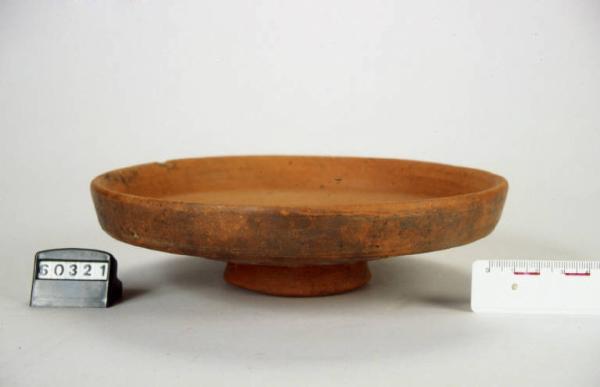 Patera a vernice nera, pareti dritte e leggermente inclinate verso l' alto, orlo verticale e piede troncoconico con spigolo esterno.