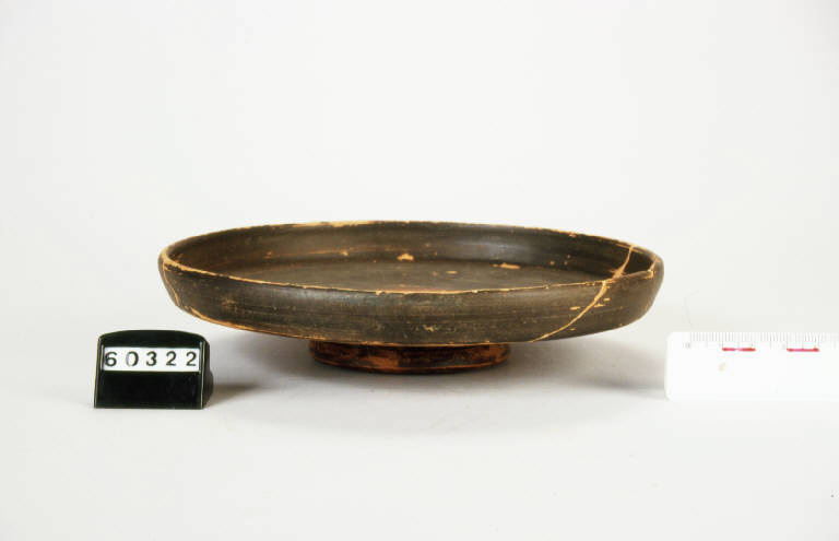 Patera a vernice nera, pareti dritte e leggermente inclinate verso l' alto, orlo verticale e piede troncoconico con spigolo esterno.