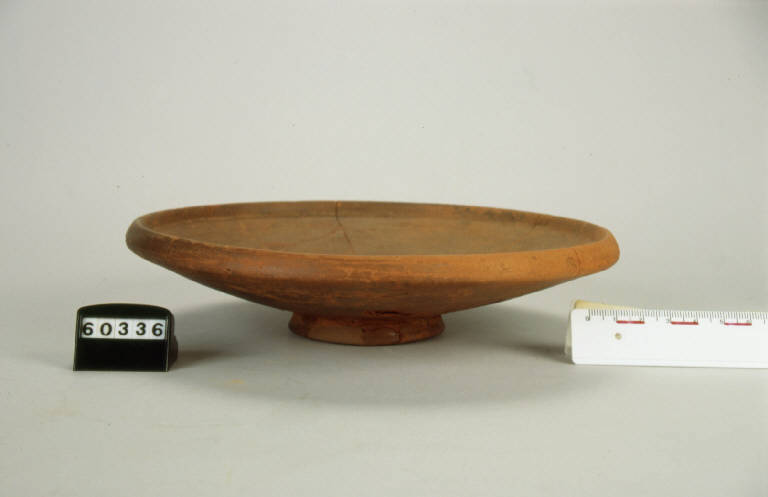 Patera a pareti rialzate, orlo introflesso, basso piede ad anello con scanalatura.