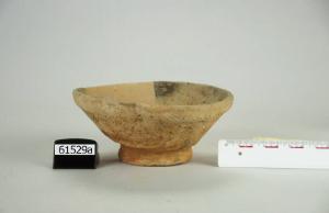 Ciotola a pareti troncoconiche, orlo ingrossato leggermente introflesso e piccolo piede diritto.
