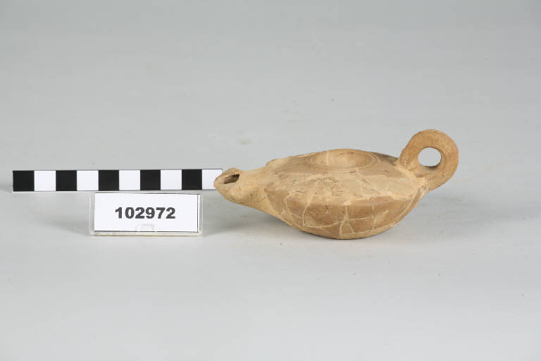 Lucerna a corpo circolare, disco incavato distinto dalla spalla da due anelli rilevati, spalla inclinata verso l'esterno, becco ogivale, fondo piano