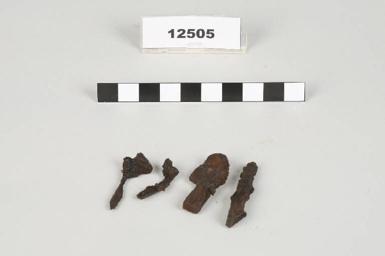 Tre chiodi in ferro con asta a sezione quadrangolare, uno dei quali presenta capocchia circolare convessa.