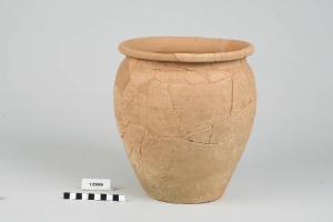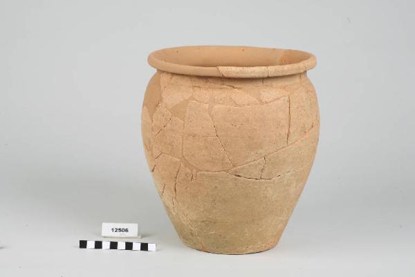 Olla ovoide con labbro verticale, breve collo e fondo piano.