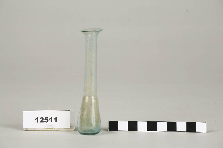 Balsamario con ampio orlo estroflesso, lungo collo cilindrico e fondo concavo.