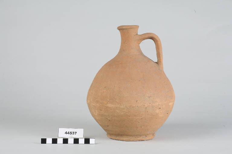 Olpe a corpo piriforme con labbro ad anello schiacciato, piede a disco ed ansa a quattro costolature.
