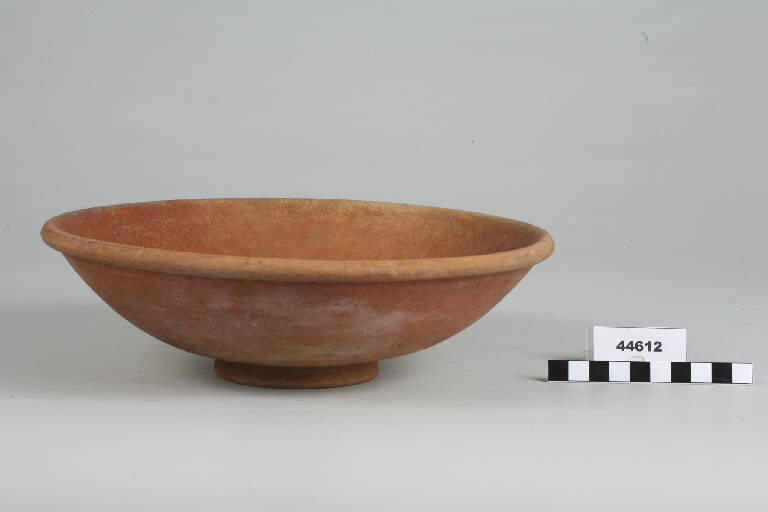 Patera a orlo ingrossato, parete arrotondata e piede a disco.