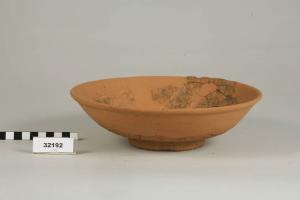 Patera in terra sigillata con orlo ingrossato, parete arrotondata e piede ad anello.