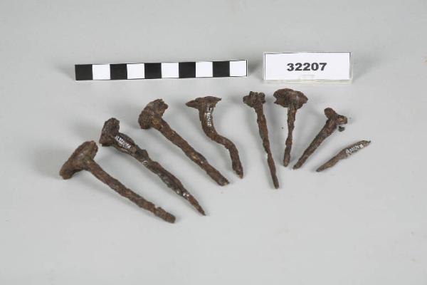 Otto chiodi in ferro con asta a sezione quadrangolare e capocchia circolare piatta.
