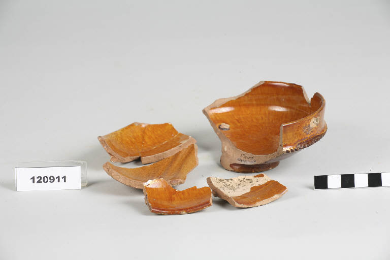 Frammenti di tazza carenata in ceramica ingubbiata sotto vetrina monocroma marrone