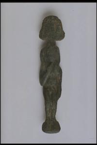 - NOTIZIE STORICO CRITICHE L'opera fa parte della raccolta egizia Giuseppe Acerbi (Castelgoffredo 1773 - 1846), costituita da reperti archeologici selezionati dall'erudito e scienziato naturalista mantovano - nominato nel 1826 Console Generale d'Austria in Egitto - tra Alessandria e Assuan, nella seconda metà degli anni Venti del XIX secolo. Entrata a far parte ufficialmente delle collezioni comunali di Mantova con il lascito di Agostino Zanelli, nipote ed unico erede dell'Acerbi, nel 1876, la raccolta ha conosciuto differenti collocazioni nel corso del tempo, fino all'attuale.\nL'esemplare é compreso nel gruppo di statuette votive - prevalentemente in bronzo - tipiche del periodo compreso tra la XXVI dinastia e l'età tolemaico-romana e rappresentanti l'intero pantheon egizio. Il dio Arpocrate, assiso e ignudo, vi é riconoscibile grazie al fastoso (benché sommario) copricapo composto da tre corone fascicolate, appoggiate su corna di montone e affiancate da piume di struzzo.