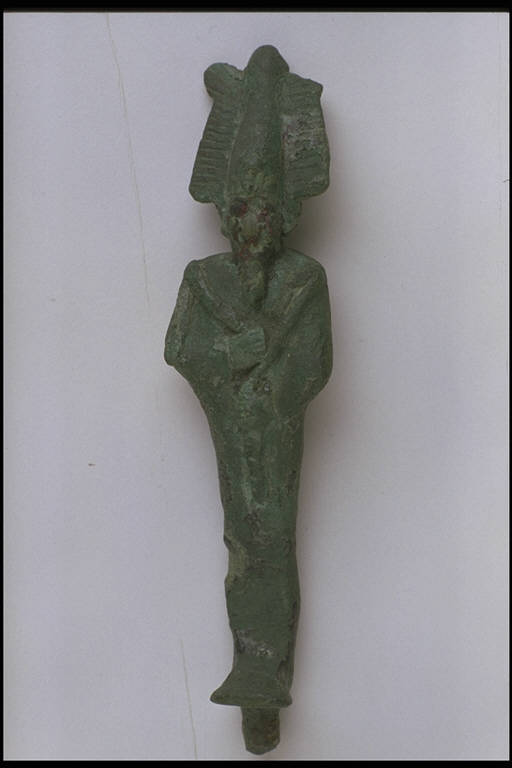 - NOTIZIE STORICO CRITICHE L'opera fa parte della raccolta egizia Giuseppe Acerbi (Castelgoffredo 1773 - 1846), costituita da reperti archeologici selezionati dall'erudito e scienziato naturalista mantovano - nominato nel 1826 Console Generale d'Austria in Egitto - tra Alessandria e Assuan, nella seconda metà degli anni Venti del XIX secolo. Entrata a far parte ufficialmente delle collezioni comunali di Mantova con il lascito di Agostino Zanelli, nipote ed unico erede dell'Acerbi, nel 1876, la raccolta ha conosciuto differenti collocazioni nel corso del tempo, fino all'attuale.\nL'esemplare é compreso nel gruppo di statuette votive - prevalentemente in bronzo - tipiche del periodo compreso tra la XXVI dinastia e l'età tolemaico-romana e rappresentanti l'intero pantheon egizio. Il dio Osiride, con caratteristico copricapo e insegne regali rette dai pugni sul petto, è rappresentato secondo la tipologia del Basso Egitto. Statuetta curata nelle proporzioni e nella definizione degli emblemi in rilievo sul petto.