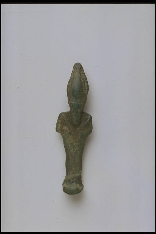 - NOTIZIE STORICO CRITICHE L'opera fa parte della raccolta egizia Giuseppe Acerbi (Castelgoffredo 1773 - 1846), costituita da reperti archeologici selezionati dall'erudito e scienziato naturalista mantovano - nominato nel 1826 Console Generale d'Austria in Egitto - tra Alessandria e Assuan, nella seconda metà degli anni Venti del XIX secolo. Entrata a far parte ufficialmente delle collezioni comunali di Mantova con il lascito di Agostino Zanelli, nipote ed unico erede dell'Acerbi, nel 1876, la raccolta ha conosciuto differenti collocazioni nel corso del tempo, fino all'attuale.\nL'esemplare é compreso nel gruppo di statuette votive - prevalentemente in bronzo - tipiche del periodo compreso tra la XXVI dinastia e l'età tolemaico-romana e rappresentanti l'intero pantheon egizio. Il dio Osiride é rappresentato con caratteristico copricapo e insegne regali rette dai pugni sul petto. Del copricapo si conserva solamente la tiara; ancora in parte leggibili gli attributi.