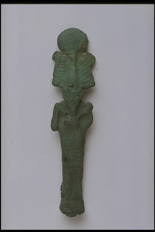 - NOTIZIE STORICO CRITICHE L'opera fa parte della raccolta egizia Giuseppe Acerbi (Castelgoffredo 1773 - 1846), costituita da reperti archeologici selezionati dall'erudito e scienziato naturalista mantovano - nominato nel 1826 Console Generale d'Austria in Egitto - tra Alessandria e Assuan, nella seconda metà degli anni Venti del XIX secolo. Entrata a far parte ufficialmente delle collezioni comunali di Mantova con il lascito di Agostino Zanelli, nipote ed unico erede dell'Acerbi, nel 1876, la raccolta ha conosciuto differenti collocazioni nel corso del tempo, fino all'attuale.\nL'esemplare é compreso nel gruppo di statuette votive - prevalentemente in bronzo - tipiche del periodo compreso tra la XXVI dinastia e l'età tolemaico-romana e rappresentanti l'intero pantheon egizio. Il dio Osiride, con caratteristico copricapo e insegne regali rette dai pugni sul petto, è probabilmente rappresentato secondo la tipologia del Medio Egitto. Solo il copricapo é modellato con cura di dettagli.