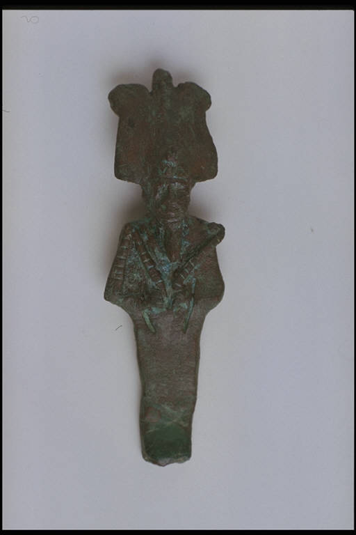 - NOTIZIE STORICO CRITICHE L'opera fa parte della raccolta egizia Giuseppe Acerbi (Castelgoffredo 1773 - 1846), costituita da reperti archeologici selezionati dall'erudito e scienziato naturalista mantovano - nominato nel 1826 Console Generale d'Austria in Egitto - tra Alessandria e Assuan, nella seconda metà degli anni Venti del XIX secolo. Entrata a far parte ufficialmente delle collezioni comunali di Mantova con il lascito di Agostino Zanelli, nipote ed unico erede dell'Acerbi, nel 1876, la raccolta ha conosciuto differenti collocazioni nel corso del tempo, fino all'attuale.\nL'esemplare é compreso nel gruppo di statuette votive - prevalentemente in bronzo - tipiche del periodo compreso tra la XXVI dinastia e l'età tolemaico-romana e rappresentanti l'intero pantheon egizio. Il dio Osiride, con caratteristico copricapo e insegne regali rette dai pugni sul petto, è rappresentato secondo la tipologia del Medio Egitto. Nel complesso la figura appare tozza nelle proporzioni e grossolana nella fattura.