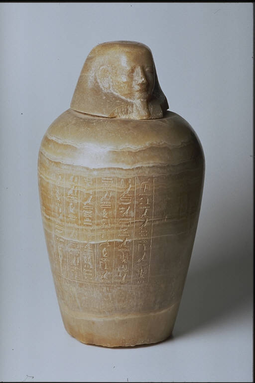 - NOTIZIE STORICO CRITICHE L'opera fa parte della raccolta egizia Giuseppe Acerbi (Castelgoffredo 1773 - 1846), costituita da reperti archeologici selezionati dall'erudito e scienziato naturalista mantovano - nominato nel 1826 Console Generale d'Austria in Egitto - tra Alessandria e Assuan, nella seconda metà degli anni Venti del XIX secolo. Entrata a far parte ufficialmente delle collezioni comunali di Mantova con il lascito di Agostino Zanelli, nipote ed unico erede dell'Acerbi, nel 1876, la raccolta ha conosciuto differenti collocazioni nel corso del tempo, fino all'attuale.\nIl vaso a spalla fungeva da contenitore delle viscere del defunto ed era parte del medesimo corredo cui apparteneva il canopo in cat. 227. La lavorazione del vaso e del coperchio a testa umana (pertinente) é molto accurata, così come l'incisione del testo sul corpo, ripartito in sei colonne racchiuse da un rettangolo e separate da linee verticali. Il coperchio non si solleva dal corpo del vaso e il volto non é in asse con il testo.