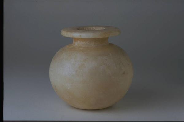 - NOTIZIE STORICO CRITICHE L'opera fa parte della raccolta egizia Giuseppe Acerbi (Castelgoffredo 1773 - 1846), costituita da reperti archeologici selezionati dall'erudito e scienziato naturalista mantovano - nominato nel 1826 Console Generale d'Austria in Egitto - tra Alessandria e Assuan, nella seconda metà degli anni Venti del XIX secolo. Entrata a far parte ufficialmente delle collezioni comunali di Mantova con il lascito di Agostino Zanelli, nipote ed unico erede dell'Acerbi, nel 1876, la raccolta ha conosciuto differenti collocazioni nel corso del tempo, fino all'attuale.\nIl pezzo rientra nel gruppo di contenitori in alabastro e in bronzo a destinazione funeraria, riproducenti analoghi oggetti di uso quotidiano e domestico. Il vaso, a corpo globulare e fondo piatto, presenta labbro espanso sul collo basso. La superficie del recipiente é accuratamente levigata, sia internamente sia esternamente.