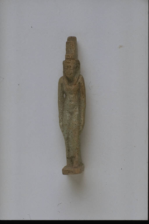 - NOTIZIE STORICO CRITICHE L'opera fa parte della raccolta egizia Giuseppe Acerbi (Castelgoffredo 1773 - 1846), costituita da reperti archeologici selezionati dall'erudito e scienziato naturalista mantovano - nominato nel 1826 Console Generale d'Austria in Egitto - tra Alessandria e Assuan, nella seconda metà degli anni Venti del XIX secolo. Entrata a far parte ufficialmente delle collezioni comunali di Mantova con il lascito di Agostino Zanelli, nipote ed unico erede dell'Acerbi, nel 1876, la raccolta ha conosciuto differenti collocazioni nel corso del tempo, fino all'attuale.\nL'amuleto rientra in un cospicuo gruppo di oggetti analoghi per tipologia e funzione (apotropaica/magica) e, tra questi, nella serie di amuleti raffiguranti divinità. Iside - sorella e sposa di Osiride, madre di Horus - é dea protettrice da mali fisici e insidie. La figura é slanciata e risponde ai canoni della statuaria; si identifica per il diadema con simbolo geroglifico del suo nome, secondo tipologia ricorrente.