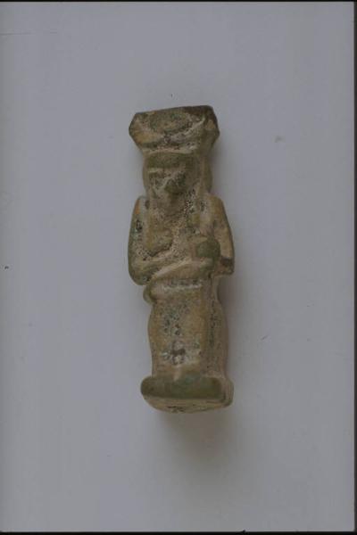- NOTIZIE STORICO CRITICHE L'opera fa parte della raccolta egizia Giuseppe Acerbi (Castelgoffredo 1773 - 1846), costituita da reperti archeologici selezionati dall'erudito e scienziato naturalista mantovano - nominato nel 1826 Console Generale d'Austria in Egitto - tra Alessandria e Assuan, nella seconda metà degli anni Venti del XIX secolo. Entrata a far parte ufficialmente delle collezioni comunali di Mantova con il lascito di Agostino Zanelli, nipote ed unico erede dell'Acerbi, nel 1876, la raccolta ha conosciuto differenti collocazioni nel corso del tempo, fino all'attuale.\nL'amuleto rientra in un cospicuo gruppo di oggetti analoghi per tipologia e funzione (apotropaica/magica) e, tra questi, nella serie di amuleti raffiguranti divinità. Iside - sorella e sposa di Osiride, madre di Horus - é dea protettrice da mali fisici e insidie. La figura é assisa in trono e in atto di allattare il figlio Horus. Il diadema é costituito da un disco solare tra corna di vacca, peculiare in origine della dea Hathor.