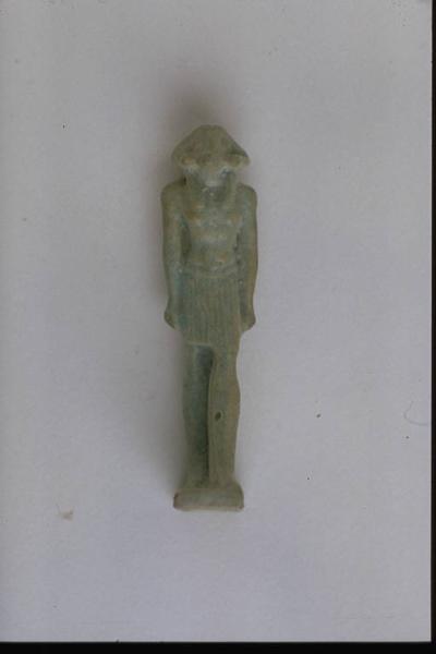 - NOTIZIE STORICO CRITICHE L'opera fa parte della raccolta egizia Giuseppe Acerbi (Castelgoffredo 1773 - 1846), costituita da reperti archeologici selezionati dall'erudito e scienziato naturalista mantovano - nominato nel 1826 Console Generale d'Austria in Egitto - tra Alessandria e Assuan, nella seconda metà degli anni Venti del XIX secolo. Entrata a far parte ufficialmente delle collezioni comunali di Mantova con il lascito di Agostino Zanelli, nipote ed unico erede dell'Acerbi, nel 1876, la raccolta ha conosciuto differenti collocazioni nel corso del tempo, fino all'attuale.\nL'amuleto rientra in un cospicuo gruppo di oggetti analoghi per tipologia e funzione (apotropaica/magica) e, tra questi, nella serie di amuleti raffiguranti divinità. Khnum, dio che modella il corpo dell'uomo e il suo "ka", é rappresentato secondo l'usuale iconografia - con corpo umano e testa d'ariete - qui seguita puntigliosamente e con grande attenzione alla resa dei dettagli.