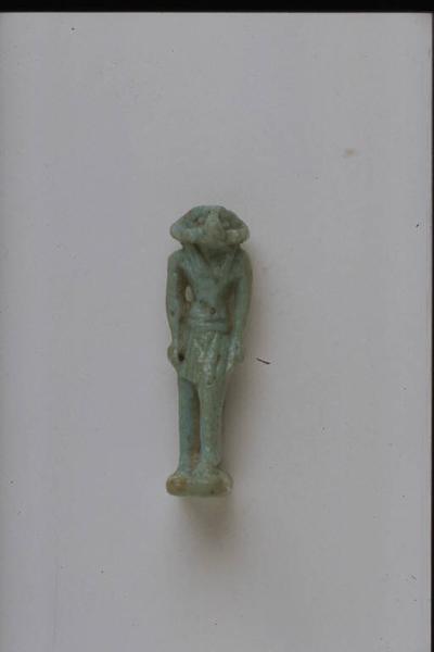 - NOTIZIE STORICO CRITICHE L'opera fa parte della raccolta egizia Giuseppe Acerbi (Castelgoffredo 1773 - 1846), costituita da reperti archeologici selezionati dall'erudito e scienziato naturalista mantovano - nominato nel 1826 Console Generale d'Austria in Egitto - tra Alessandria e Assuan, nella seconda metà degli anni Venti del XIX secolo. Entrata a far parte ufficialmente delle collezioni comunali di Mantova con il lascito di Agostino Zanelli, nipote ed unico erede dell'Acerbi, nel 1876, la raccolta ha conosciuto differenti collocazioni nel corso del tempo, fino all'attuale.\nL'amuleto rientra in un cospicuo gruppo di oggetti analoghi per tipologia e funzione (apotropaica/magica) e, tra questi, nella serie di amuleti raffiguranti divinità. Khnum, dio che modella il corpo dell'uomo e il suo "ka", é rappresentato secondo l'usuale iconografia - con corpo umano e testa d'ariete - qui seguita puntigliosamente e con grande attenzione alla resa dei dettagli.