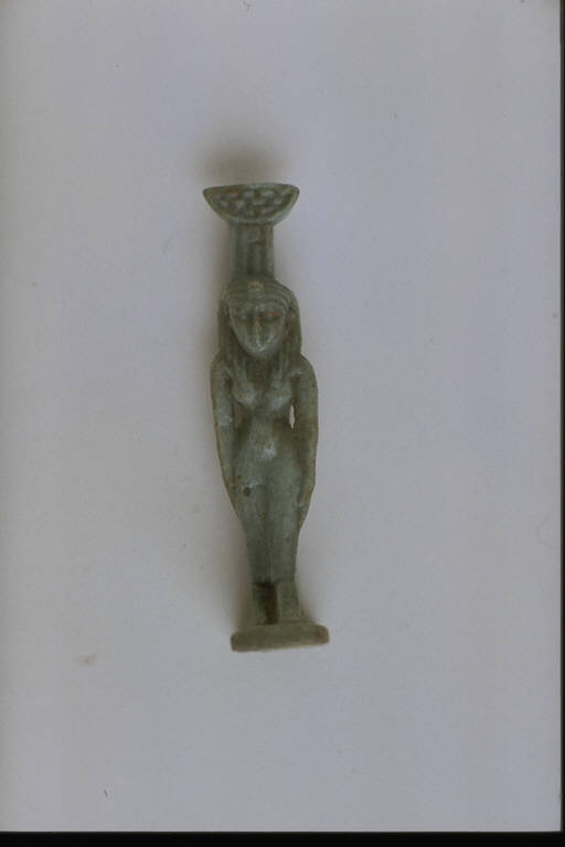 - NOTIZIE STORICO CRITICHE L'opera fa parte della raccolta egizia Giuseppe Acerbi (Castelgoffredo 1773 - 1846), costituita da reperti archeologici selezionati dall'erudito e scienziato naturalista mantovano - nominato nel 1826 Console Generale d'Austria in Egitto - tra Alessandria e Assuan, nella seconda metà degli anni Venti del XIX secolo. Entrata a far parte ufficialmente delle collezioni comunali di Mantova con il lascito di Agostino Zanelli, nipote ed unico erede dell'Acerbi, nel 1876, la raccolta ha conosciuto differenti collocazioni nel corso del tempo, fino all'attuale.\nL'amuleto rientra in un cospicuo gruppo di oggetti analoghi per tipologia e funzione (apotropaica/magica) e, tra questi, nella serie di amuleti raffiguranti divinità. La dea Nefti, sorella di Iside, é rappresentata come figura femminile diademata con i grafemi del proprio nome. L'amuleto presenta una fattura accurata: la figura slanciata e i lineamenti ben curati indicherebbero una fattura di buona epoca.