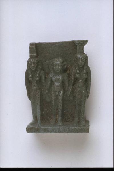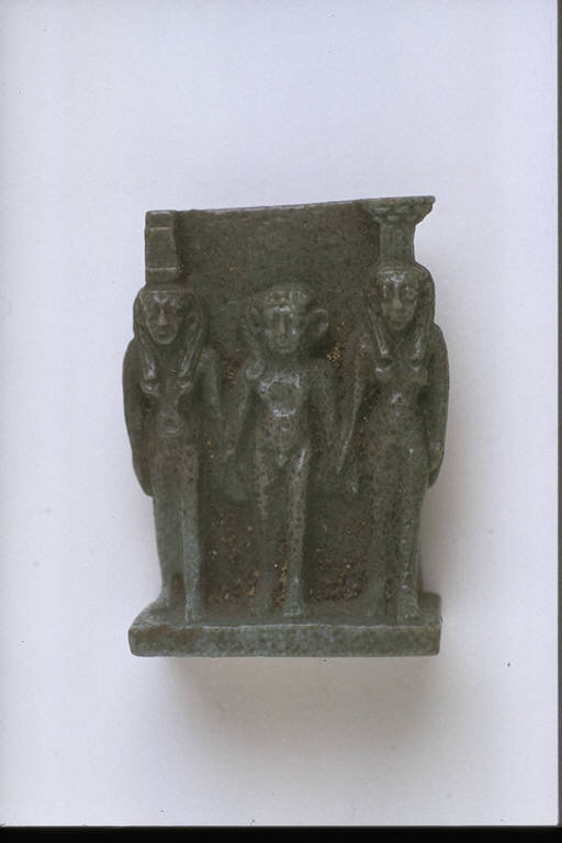 - NOTIZIE STORICO CRITICHE L'opera fa parte della raccolta egizia Giuseppe Acerbi (Castelgoffredo 1773 - 1846), costituita da reperti archeologici selezionati dall'erudito e scienziato naturalista mantovano - nominato nel 1826 Console Generale d'Austria in Egitto - tra Alessandria e Assuan, nella seconda metà degli anni Venti del XIX secolo. Entrata a far parte ufficialmente delle collezioni comunali di Mantova con il lascito di Agostino Zanelli, nipote ed unico erede dell'Acerbi, nel 1876, la raccolta ha conosciuto differenti collocazioni nel corso del tempo, fino all'attuale.\nL'amuleto rientra in un cospicuo gruppo di oggetti analoghi per tipologia e funzione (apotropaica/magica) e, tra questi, nella serie di amuleti raffiguranti divinità. Il pezzo propone l'immagine unitaria delle tre divinità Iside, Arpocrate, Nefti, secondo il mito narrante il soccorso di Arpocrate da parte della madre e della sorella in una situazione di pericolo. Le figure stanti sono addossate a un pannello dorsale. Base rettangolare.