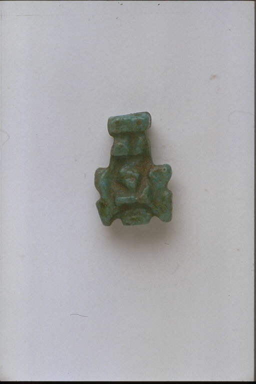 - NOTIZIE STORICO CRITICHE L'opera fa parte della raccolta egizia Giuseppe Acerbi (Castelgoffredo 1773 - 1846), costituita da reperti archeologici selezionati dall'erudito e scienziato naturalista mantovano - nominato nel 1826 Console Generale d'Austria in Egitto - tra Alessandria e Assuan, nella seconda metà degli anni Venti del XIX secolo. Entrata a far parte ufficialmente delle collezioni comunali di Mantova con il lascito di Agostino Zanelli, nipote ed unico erede dell'Acerbi, nel 1876, la raccolta ha conosciuto differenti collocazioni nel corso del tempo, fino all'attuale.\nL'amuleto rientra in un cospicuo gruppo di oggetti analoghi per tipologia e funzione (apotropaica/magica) e, tra questi, nella serie di amuleti raffiguranti divinità. Shu - dio dell'aria e dello spazio tra terra e cielo - é rappresentato come figura umana semi inginocchiata e braccia levate a sostenere la volta celeste: caratteri qui appena leggibili a causa delle ridottissime dimensioni del modellato sommario dell'amuleto.