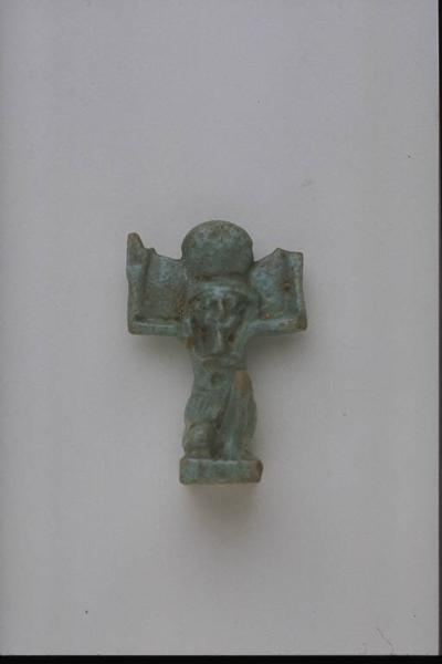 - NOTIZIE STORICO CRITICHE L'opera fa parte della raccolta egizia Giuseppe Acerbi (Castelgoffredo 1773 - 1846), costituita da reperti archeologici selezionati dall'erudito e scienziato naturalista mantovano - nominato nel 1826 Console Generale d'Austria in Egitto - tra Alessandria e Assuan, nella seconda metà degli anni Venti del XIX secolo. Entrata a far parte ufficialmente delle collezioni comunali di Mantova con il lascito di Agostino Zanelli, nipote ed unico erede dell'Acerbi, nel 1876, la raccolta ha conosciuto differenti collocazioni nel corso del tempo, fino all'attuale.\nL'amuleto rientra in un cospicuo gruppo di oggetti analoghi per tipologia e funzione (apotropaica/magica) e, tra questi, nella serie di amuleti raffiguranti divinità. Shu - dio dell'aria e dello spazio tra terra e cielo - é rappresentato come figura umana semi inginocchiata e braccia levate a sostenere la volta celeste: caratteri qui sottolineati da un modellato accurato. Il dio è diademato di piuma, grafema del proprio nome.