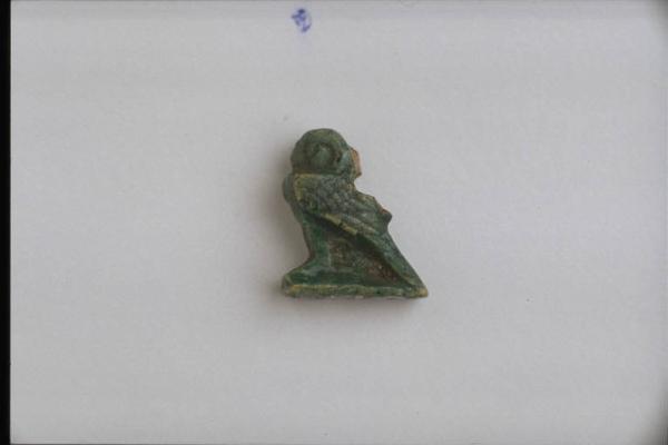 - NOTIZIE STORICO CRITICHE L'opera fa parte della raccolta egizia Giuseppe Acerbi (Castelgoffredo 1773 - 1846), costituita da reperti archeologici selezionati dall'erudito e scienziato naturalista mantovano - nominato nel 1826 Console Generale d'Austria in Egitto - tra Alessandria e Assuan, nella seconda metà degli anni Venti del XIX secolo. Entrata a far parte ufficialmente delle collezioni comunali di Mantova con il lascito di Agostino Zanelli, nipote ed unico erede dell'Acerbi, nel 1876, la raccolta ha conosciuto differenti collocazioni nel corso del tempo, fino all'attuale.\nL'amuleto rientra in un cospicuo gruppo di oggetti analoghi per tipologia e funzione (apotropaica/magica) e, tra questi, nella serie di 22 amuleti raffiguranti animali, la cui venerazione interessa l'Egitto dal periodo storico fino all'Età Romana. Il falco - di forme piuttosto geometriche e squadrate - fa corpo con la base, e presenta piume disegnate in modo naturalistico. Lo completa un occhiello sul dorso (spezzato).