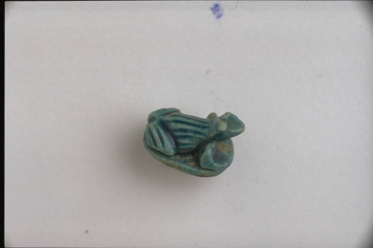 - NOTIZIE STORICO CRITICHE L'opera fa parte della raccolta egizia Giuseppe Acerbi (Castelgoffredo 1773 - 1846), costituita da reperti archeologici selezionati dall'erudito e scienziato naturalista mantovano - nominato nel 1826 Console Generale d'Austria in Egitto - tra Alessandria e Assuan, nella seconda metà degli anni Venti del XIX secolo. Entrata a far parte ufficialmente delle collezioni comunali di Mantova con il lascito di Agostino Zanelli, nipote ed unico erede dell'Acerbi, nel 1876, la raccolta ha conosciuto differenti collocazioni nel corso del tempo, fino all'attuale.\nL'amuleto rientra in un cospicuo gruppo di oggetti analoghi per tipologia e funzione (apotropaica/magica) e, tra questi, nella serie di 22 amuleti raffiguranti animali, la cui venerazione interessa l'Egitto dal periodo storico fino all'Età Romana. La rana - sacra alla dea Heket e simbolo di fertilità - poggia su una base ellittica con inciso sulla faccia opposta l'occhio "udat". L'oggetto potrebbe aver avuto anche funzione di sigillo.