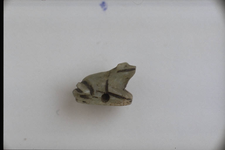 - NOTIZIE STORICO CRITICHE L'opera fa parte della raccolta egizia Giuseppe Acerbi (Castelgoffredo 1773 - 1846), costituita da reperti archeologici selezionati dall'erudito e scienziato naturalista mantovano - nominato nel 1826 Console Generale d'Austria in Egitto - tra Alessandria e Assuan, nella seconda metà degli anni Venti del XIX secolo. Entrata a far parte ufficialmente delle collezioni comunali di Mantova con il lascito di Agostino Zanelli, nipote ed unico erede dell'Acerbi, nel 1876, la raccolta ha conosciuto differenti collocazioni nel corso del tempo, fino all'attuale.\nL'amuleto rientra in un cospicuo gruppo di oggetti analoghi per tipologia e funzione (apotropaica/magica) e, tra questi, nella serie di 22 amuleti raffiguranti animali, la cui venerazione interessa l'Egitto dal periodo storico fino all'Età Romana. La rana - sacra alla dea Heket e simbolo di fertilità - poggia su una base quasi corcolare forata trasversalmente. Particolarmente curata nei particolari, nonostante le dimensioni ridottissime.