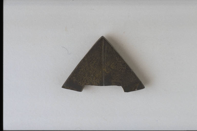 - NOTIZIE STORICO CRITICHE L'opera fa parte della raccolta egizia Giuseppe Acerbi (Castelgoffredo 1773 - 1846), costituita da reperti archeologici selezionati dall'erudito e scienziato naturalista mantovano - nominato nel 1826 Console Generale d'Austria in Egitto - tra Alessandria e Assuan, nella seconda metà degli anni Venti del XIX secolo. Entrata a far parte ufficialmente delle collezioni comunali di Mantova con il lascito di Agostino Zanelli, nipote ed unico erede dell'Acerbi, nel 1876, la raccolta ha conosciuto differenti collocazioni nel corso del tempo, fino all'attuale.\nL'amuleto rientra in un cospicuo gruppo di oggetti analoghi per tipologia e funzione (apotropaica/magica) e, tra questi, nella serie di 36 amuleti raffiguranti simboli. La livella a filo a piombo ("sekek"), simbolo di equilibrio e stabilità diffuso dalla XXVI din. all'Età Romana, ha forma di triangolo isoscele con lato di base risegato; una tacca nel mezzo segna il traguardo del filo a piombo.
