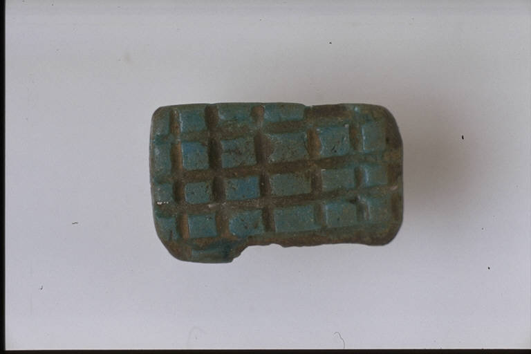 - NOTIZIE STORICO CRITICHE L'opera fa parte della raccolta egizia Giuseppe Acerbi (Castelgoffredo 1773 - 1846), costituita da reperti archeologici selezionati dall'erudito e scienziato naturalista mantovano - nominato nel 1826 Console Generale d'Austria in Egitto - tra Alessandria e Assuan, nella seconda metà degli anni Venti del XIX secolo. Entrata a far parte ufficialmente delle collezioni comunali di Mantova con il lascito di Agostino Zanelli, nipote ed unico erede dell'Acerbi, nel 1876, la raccolta ha conosciuto differenti collocazioni nel corso del tempo, fino all'attuale.\nL'amuleto rientra in un gruppo di cinque oggetti dalla probabile duplice funzione di sigilli/amuleti. Gli Egizi adottarono con particolare frequenza la tipologia del sigillo a stampo, spesso forato per consentirne la sospensione. La forma del sigillo in esame é quasi piramidale, con piccolo foro al vertice: la base rettangolare piana reca un reticolo di linee incise.