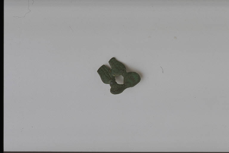 - NOTIZIE STORICO CRITICHE L'opera fa parte della raccolta egizia Giuseppe Acerbi (Castelgoffredo 1773 - 1846), costituita da reperti archeologici selezionati dall'erudito e scienziato naturalista mantovano - nominato nel 1826 Console Generale d'Austria in Egitto - tra Alessandria e Assuan, nella seconda metà degli anni Venti del XIX secolo. Entrata a far parte ufficialmente delle collezioni comunali di Mantova con il lascito di Agostino Zanelli, nipote ed unico erede dell'Acerbi, nel 1876, la raccolta ha conosciuto differenti collocazioni nel corso del tempo, fino all'attuale.\nIl pendente a doppio ureo rientra in un gruppo di oggetti di uso quotidiano prevalentemente in bronzo. Gli orecchini entrano nella moda egizia a partire al Nuovo Regno, diffondendosi dapprima tra donne e uomini, quindi tra questi ultimi solo fino al termine della pubertà. L'esemplare in esame risponderebbe alla tipologia diffusasi tra fine XVIII din. e XX din. per caratteristiche quali dimensioni e lavorazione integrata con doratura.