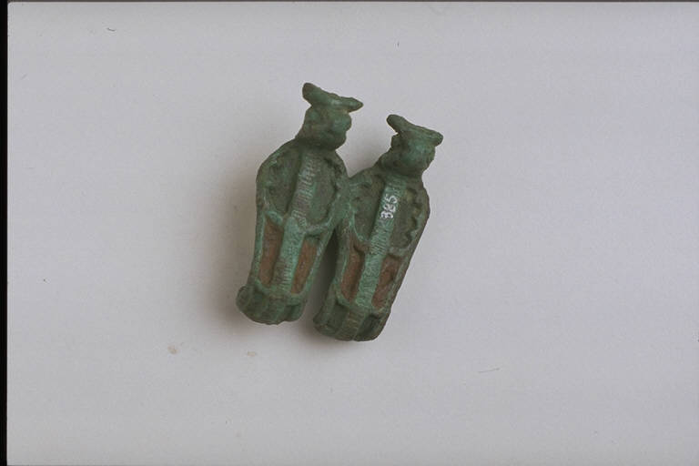 - NOTIZIE STORICO CRITICHE L'opera fa parte della raccolta egizia Giuseppe Acerbi (Castelgoffredo 1773 - 1846), costituita da reperti archeologici selezionati dall'erudito e scienziato naturalista mantovano - nominato nel 1826 Console Generale d'Austria in Egitto - tra Alessandria e Assuan, nella seconda metà degli anni Venti del XIX secolo. Entrata a far parte ufficialmente delle collezioni comunali di Mantova con il lascito di Agostino Zanelli, nipote ed unico erede dell'Acerbi, nel 1876, la raccolta ha conosciuto differenti collocazioni nel corso del tempo, fino all'attuale.\nIl pendente a doppio ureo rientra in un gruppo di oggetti di uso quotidiano prevalentemente in bronzo. Gli orecchini entrano nella moda egizia a partire al Nuovo Regno. L'esemplare risponderebbe alla tipologia diffusasi tra fine XVIII din. e XX din. per caratteristiche quali dimensioni ridotte, occhiello posteriore e lavorazione integrata con doratura del metallo.