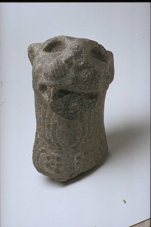 - NOTIZIE STORICO CRITICHE L'opera fa parte della raccolta egizia Giuseppe Acerbi (Castelgoffredo 1773 - 1846), costituita da reperti archeologici selezionati dall'erudito e scienziato naturalista mantovano - nominato nel 1826 Console Generale d'Austria in Egitto - tra Alessandria e Assuan, nella seconda metà degli anni Venti del XIX secolo. Entrata a far parte ufficialmente delle collezioni comunali di Mantova con il lascito di Agostino Zanelli, nipote ed unico erede dell'Acerbi, nel 1876, la raccolta ha conosciuto differenti collocazioni nel corso del tempo, fino all'attuale.\nLa testa leonina in pietra grigia - parte di una statua o, forse, di elemento architettonico decorativo - non risponde a un'iconografia egizia: le orecchie piccole e arrotondate, le orbite cave, la bocca aperta con denti in vista ricollegano la scultura all'arte orientale tardo hittita; tuttavia, il disegno decorativo della criniera e la presenza di un tralcio d'uva stilizzato sul retro della testa la accomunano a opere scultoree copte.