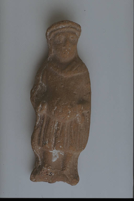 - NOTIZIE STORICO CRITICHE L'opera fa parte della raccolta egizia Giuseppe Acerbi (Castelgoffredo 1773 - 1846), costituita da reperti archeologici selezionati dall'erudito e scienziato naturalista mantovano - nominato nel 1826 Console Generale d'Austria in Egitto - tra Alessandria e Assuan, nella seconda metà degli anni Venti del XIX secolo. Entrata a far parte ufficialmente delle collezioni comunali di Mantova con il lascito di Agostino Zanelli, nipote ed unico erede dell'Acerbi, nel 1876, la raccolta ha conosciuto differenti collocazioni nel corso del tempo, fino all'attuale.\nLa piccola scultura rientra in un gruppo di opere e oggetti di età ellenistica. Si tratta di una figura di genere teatrale: un uomo dai corti capelli cinti da tenia e abbigliato con tunica e mantello. L'opera non presenta alcun rapporto con gli stilemi figurativi egizi: il modellato e il metodo di lavorazione a stampo bivalve riconducono alle caratteristiche del n.cat. 392, di analoga produzione ellenistica.