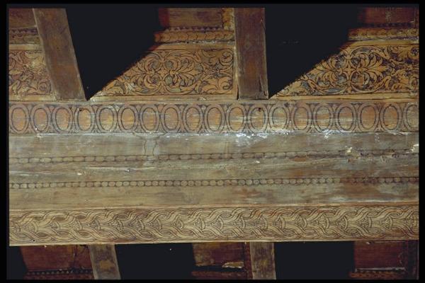 Soffitto diviso in piccoli settori quadrati con travi decorate
