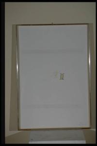 Foglio di carta patinata bianca con cornice, sulla superficie è incollata una piccola colonna in legno